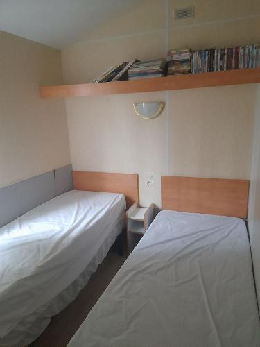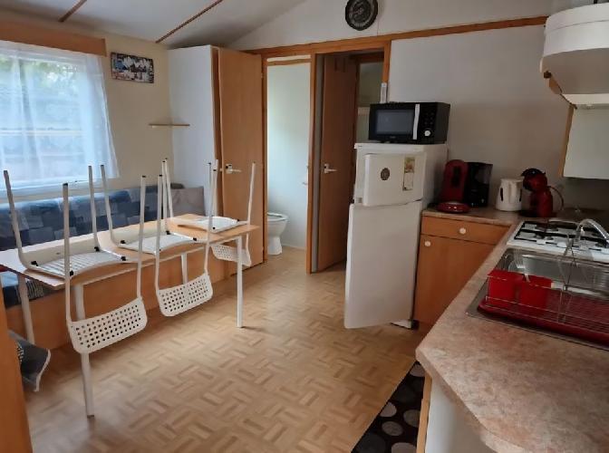 Vends Mobil home, pour cause d'achat immobilier, modèle Nirvana, de 30 m², comprenant 3 chambres (un lit deux places et deux avec deux lits 1 place), 1 pièce principale avec coin cuisine, TV, réfrigérateur, micro-ondes et coin repas (table avec une banquette convertible et chaises), 1 terrasse fermée avec table de jardin (possibilité de l'ouvrir), un cabanon (avec barbecue).