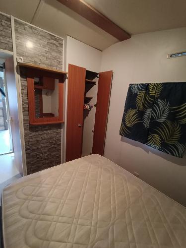 - Une chambre avec un lit double, un miroir mural et des rangements.