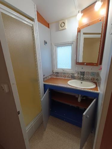- Une salle d'eau avec cabine de douche, évier, miroir, fenêtre et rangements.