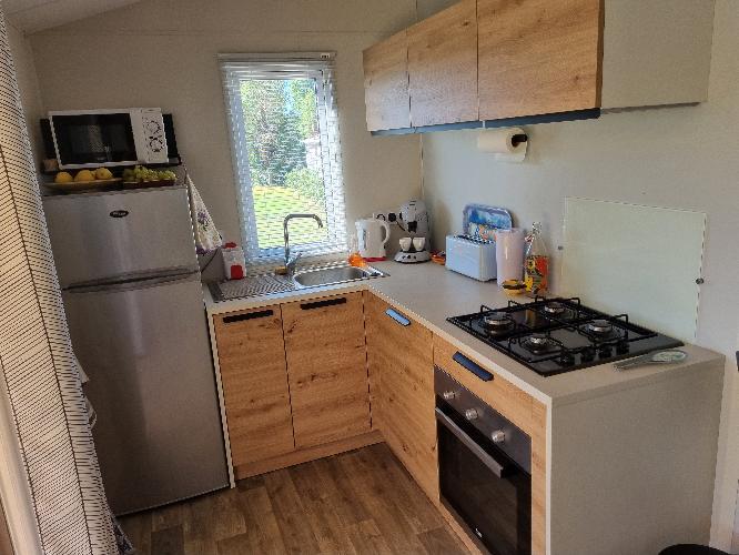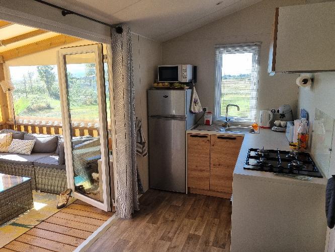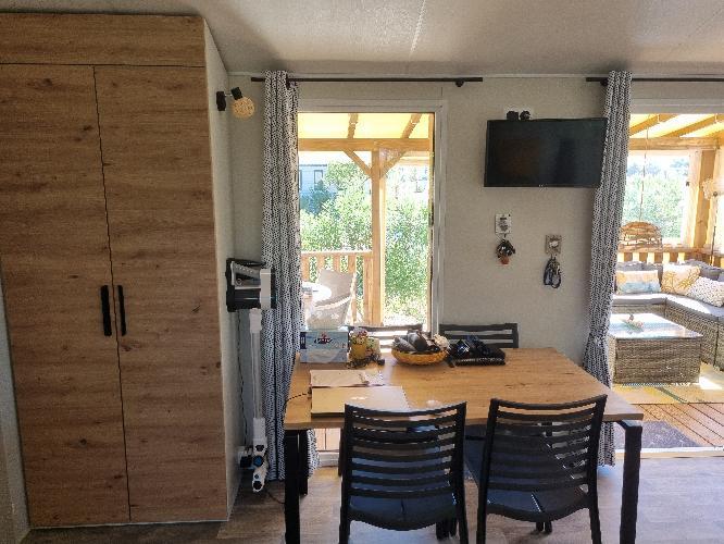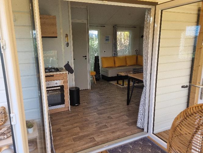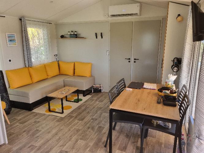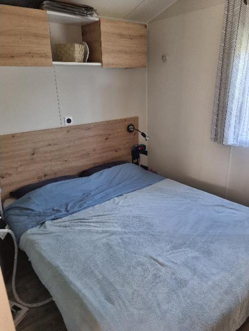Mobil-home en état neuf servi 10 semaines par an, couple de retraités, jamais loué, pack confort, lit parental de 160 cm, 2 chambres + canapé convertible 2 couchages 140 cm, surface 31 m2 et terrasse de 18m2 partiellement entoilée.