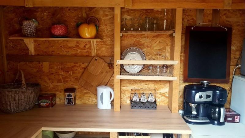 Une cuisine extérieur entièrement fermée et équipée (frigo, congélateur, plaque de cuisson à gaz, four et micro-onde, cafetière, grill pain, vaisselle, machine à laver et étendoir)