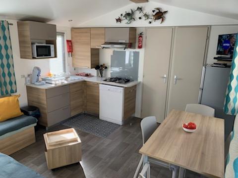 Le mobil home se compose d'une grande pièce à vivre, de deux chambres, d'une salle de bain et d'un toilette séparé.