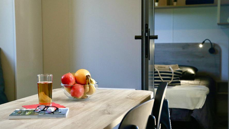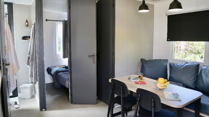 Son espace de vie lumineux, sa cuisine équipée et sa terrasse intégrée de 7 m² offrent un cadre agréable pour profiter pleinement de vos vacances en toute simplicité. Compact et pratique, il permet de bénéficier du confort essentiel du camping, dans un environnement calme et verdoyant, à proximité immédiate du littoral.