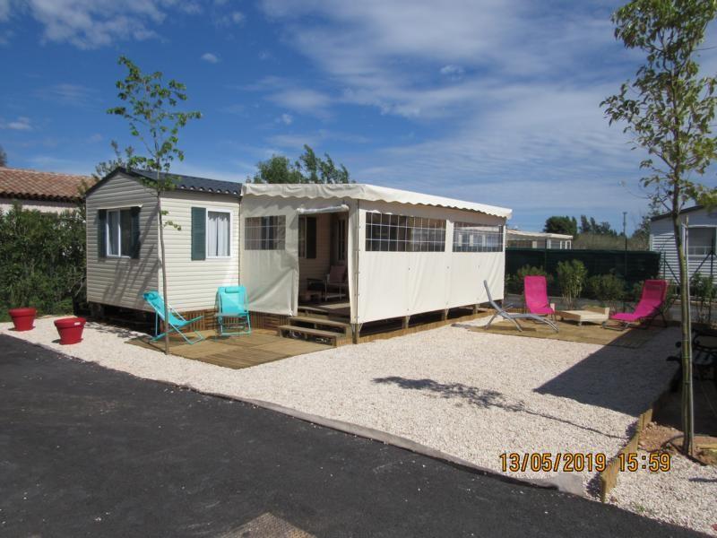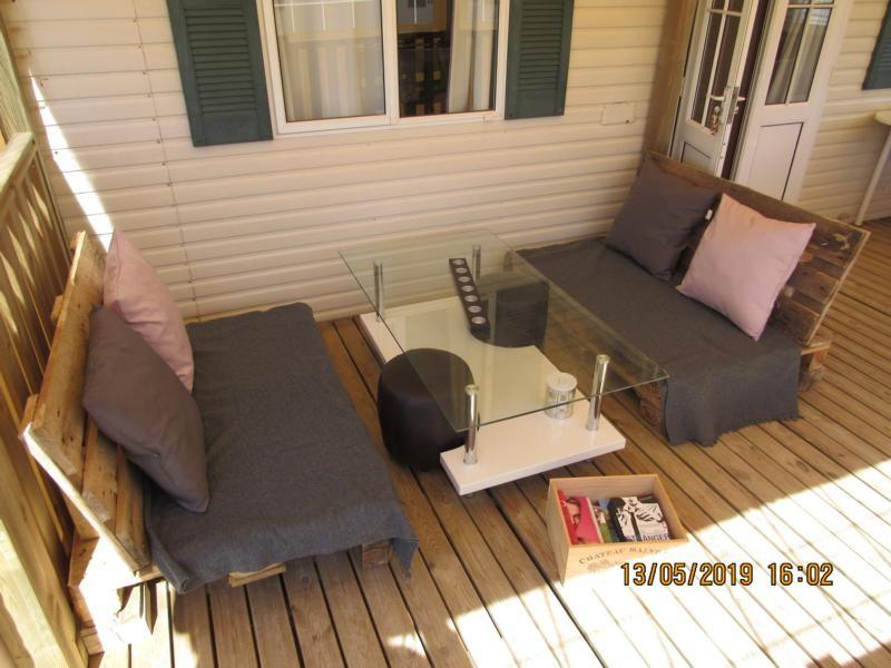Installé dans un camping 2*, le mobil home qui vient d'être mis en place est équipé d'une terrasse neuve en bois, "décapotable" à souhait. Les équipements intérieurs et extérieurs sont neufs. Une plancha remplace le barbecue au charbon de bois, interdit dans la région pour des raisons de sécurité. Vous pourrez bénéficier d'herbes aromatiques qui poussent, selon la saison, dans des jardinières installées près d'une terrasse extérieure sur laquelle il est possible de profiter du soleil, étendu sur les chaises longues.