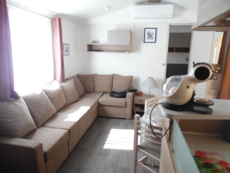 Le MobilHome se compose d'une pièce à vivre climatisée avec cuisine équipée (Plaques de cuisson, frigo-congel , four, micro ondes, lave vaisselle, machine à café, grille pain, bouilloire et tout le nécessaire de vaisselles) , beau salon avec TV, coin repas, rangements.