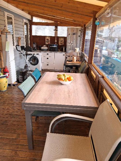 Dans une parc résidentiel très calme sans droit d'entrée. Loyer 531euros/mois eau comprise .Mobil home avec cuisine Mobalpa 4 ans ( 6500euros) + four micro ondes Electrolux + four Simems + lave vaisselle Thomson + plaque de cuisson Bosch .sur terrasse entièrement fermé de 8x2.50 cuisine d'été avec réfrigérateur LG de 217L avec une partie congélateur de 104L + servante avec plancha Krampouz + table Hesperide 135x90 avec rallonge de 135x90 + 6 fauteuils .2 places de parking + emplacement pour camping car . Abri de jardin 2.20x2.50 . Adoucisseur d'eau Laugil (2500euros) clim réversible Daikin neuve dans chaque chambre lit électrique de 90 ( possible lit en 140 ) + radiateurs Sauter à pierre de lave