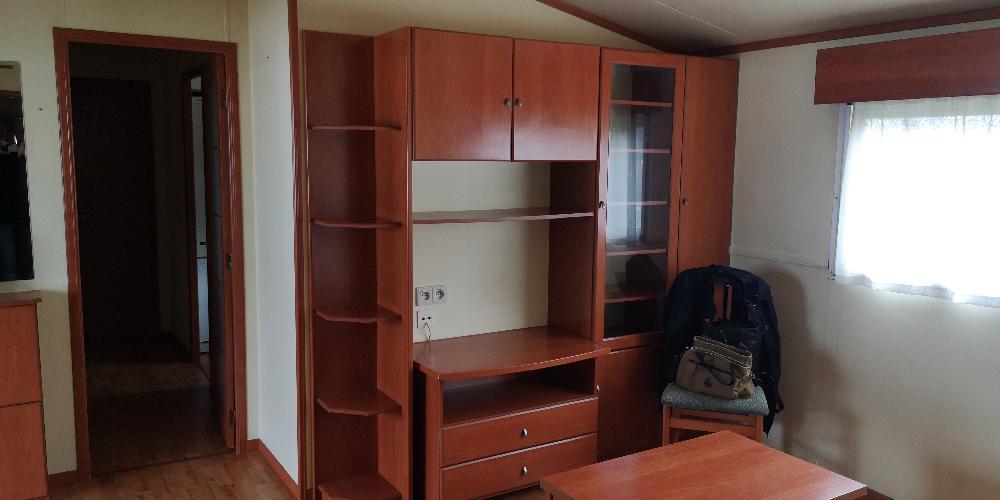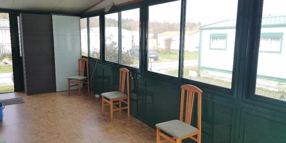 Le salon est équipé de meubles, table basse, canapé-lit, table et 6 chaises et fauteuil électrique dans véranda.