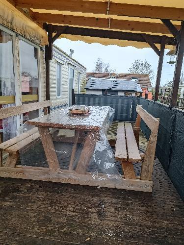 Deux chambres, grande terrasse en partie couverte avec une table pique-nique pour 8 personnes, cellier attenant au mobil-home, châlet.